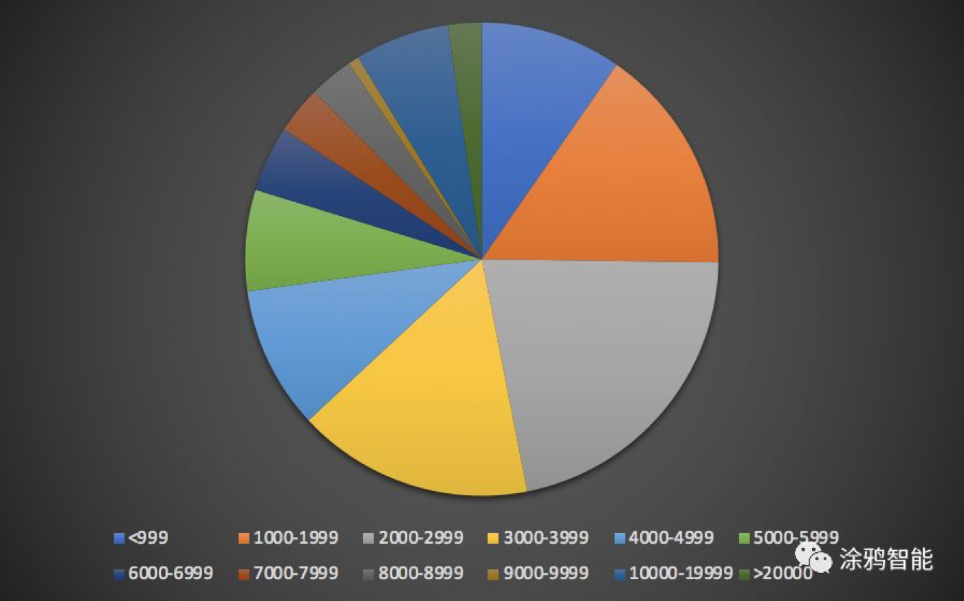 图里最大的三块分别是2000-2999、3000-3999和1000-1999区间。53%的空净价格处于1000-3999元之间。