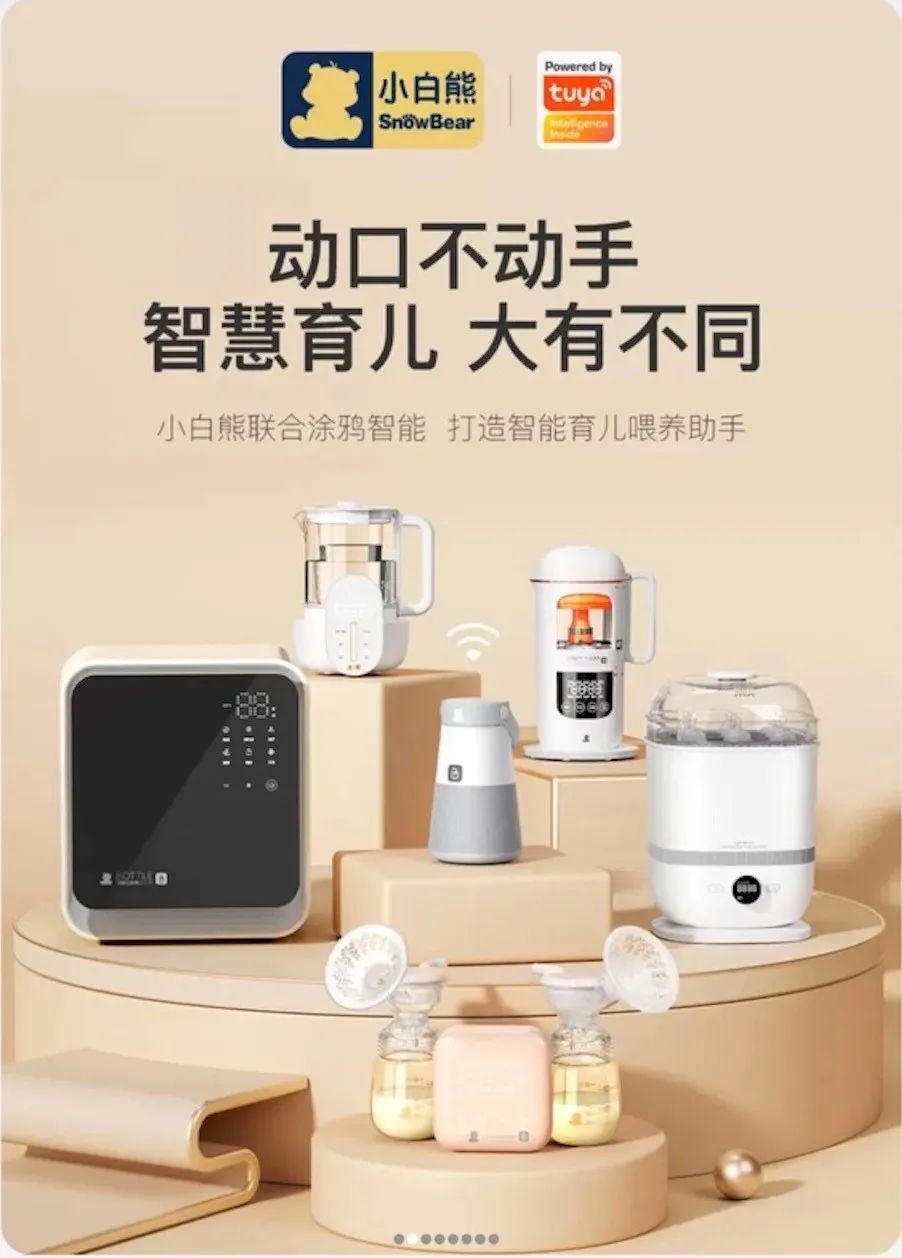 在双方达成合作两年以来,通过涂鸦IoT开发平台,小白熊已经快速实现了调奶器、吸奶器、辅食机、消毒器等近10款产品的智能化,进一步巩固“专业母婴电器智造家”的行业地位。在此基础之上,小白熊打造了完整的智能母婴电器生态,并与海量Powered by Tuya智能设备互联互通。