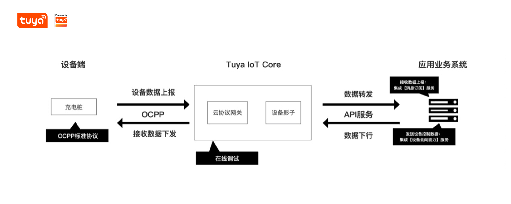那么,如何才能在涂鸦平台上,实现OCPP协议的赋能呢?很简单,客户只需到涂鸦IoT开发平台选择创建产品,选择节能能源,进入充电桩,选择生态设备接入,根据指示进行设备开发,最后选择【OCPP协议接入】方式,即可让自己的设备支持OCPP协议。能如此高效、迅捷地实现对接,得益于涂鸦IoT平台的一站式开发方案和成熟的技术支持。