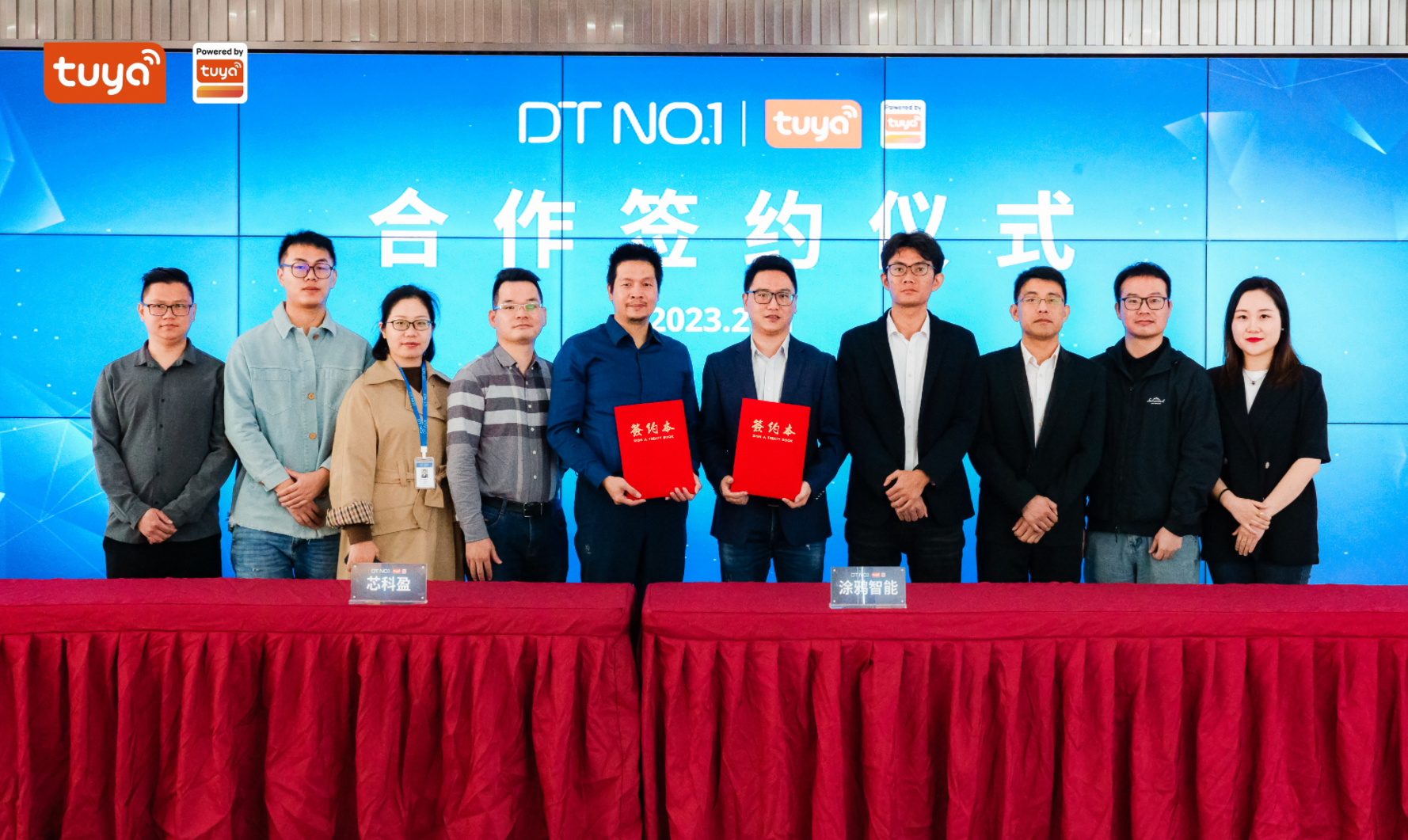涂鸦智能华东&华南大区总经理林天准、涂鸦智能语音及穿戴产品总监付信嵩、涂鸦智能大客户总监陈淼露、涂鸦智能大客户经理杨喜源、涂鸦智能家电市场负责人林鹭鹭以及芯科盈CEO韦加新、芯科盈副总经理张深发、芯科盈市场总监阙晨超等出席了本次合作签约仪式。