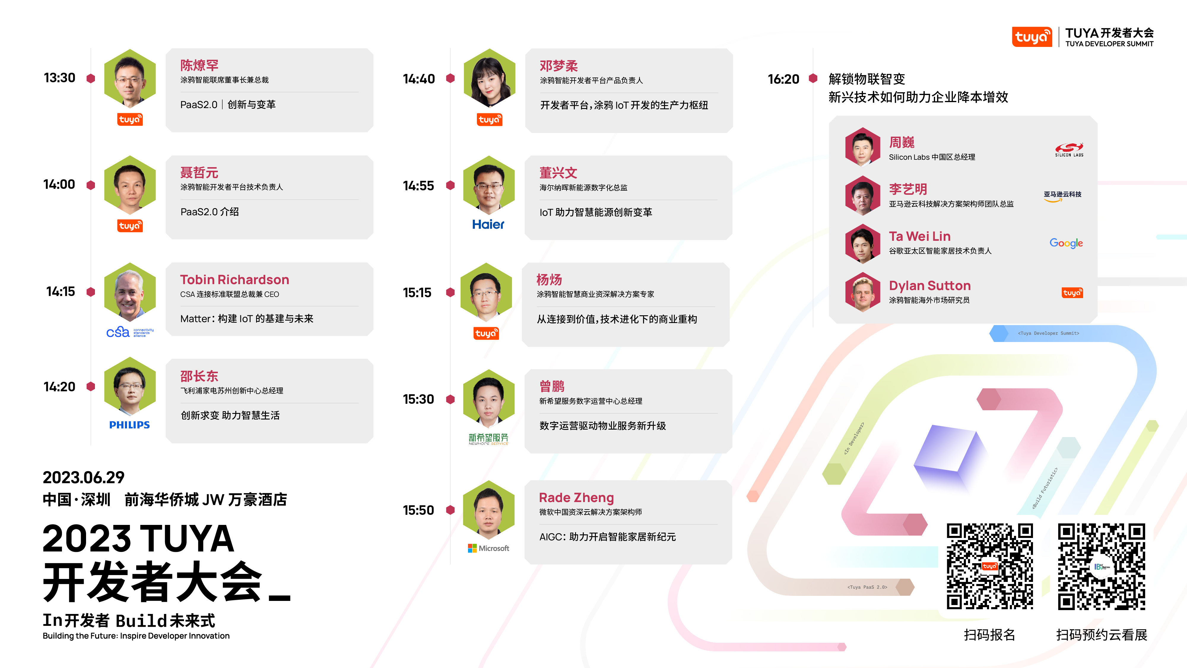 截至目前,TUYA开发者大会已经邀请了来自CSA连接标准联盟、飞利浦、海尔、新希望、微软中国的一众大咖,带来新能源、AIGC、Matter等前沿趋势的洞见以及实战经验分享。