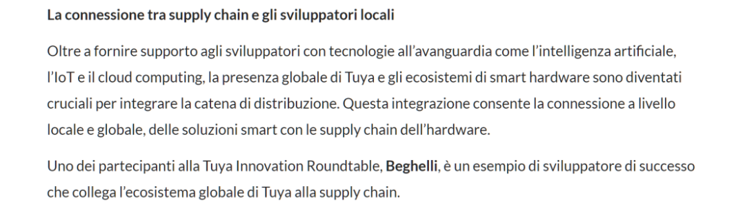 《System Integrator Magazine》报道了涂鸦助力意大利客户成功的实践经验。报道指出,除了通过先进技术如人工智能、物联网和云计算为开发者提供支持外,涂鸦的全球性和智能硬件生态系统对整合供应链至关重要。这种整合实现了智能解决方案与硬件供应链在本地和全球层面的连接。参加Tuya Innovation Roundtable Initiative(Europe)的Beghelli是一个成功开发者的例子,它将涂鸦的全球生态系统与供应链连接起来。