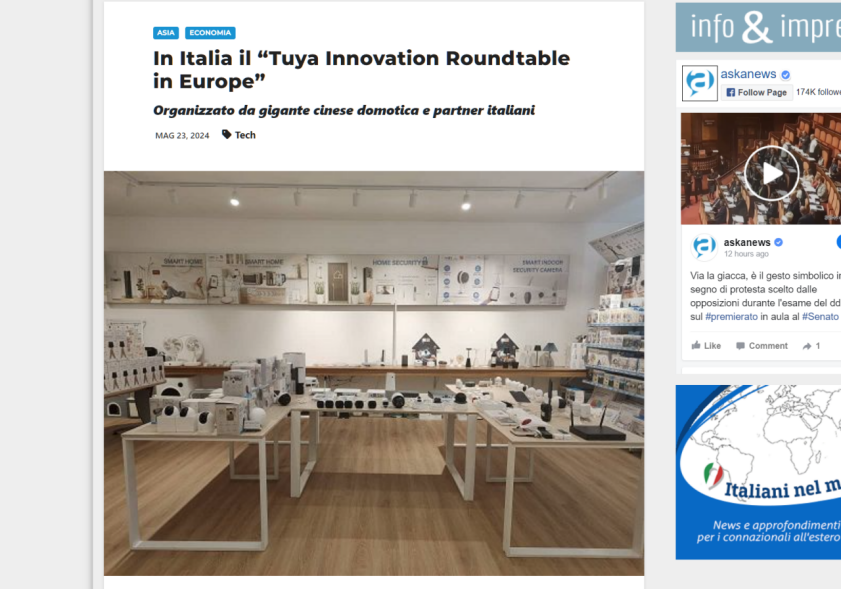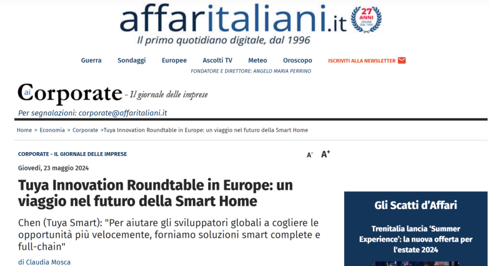 《Affaritaliani.it 》在本次活动报道中,聚焦在介绍涂鸦智能在意大利智能家居市场的前瞻性探索与实践,新闻中指出,涂鸦将不断革新AI等前沿技术,帮助意大利不同行业的客户实现智慧升级,特别是,助力客户搭建智慧能源管理系统,实现能源的节约和减排,有利于更好实现可持续发展。
