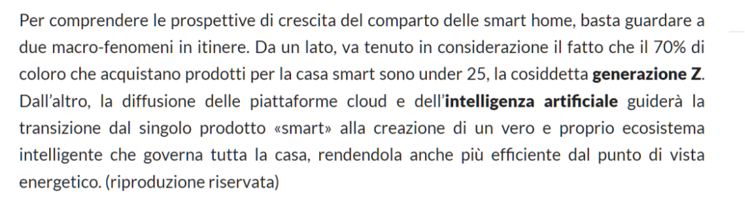 《Milano Finanza》报道中指出,意大利智能家居产品的主力购买者是25岁以下的年轻人,即所谓的Z世代。涂鸦智能这样的云平台,在人工智能等前沿技术的能力,将引导市场从单一智能产品向真正的智能生态系统过渡。这个生态系统将帮助民众轻松管理整个家庭,使其在能源效率方面更加高效。