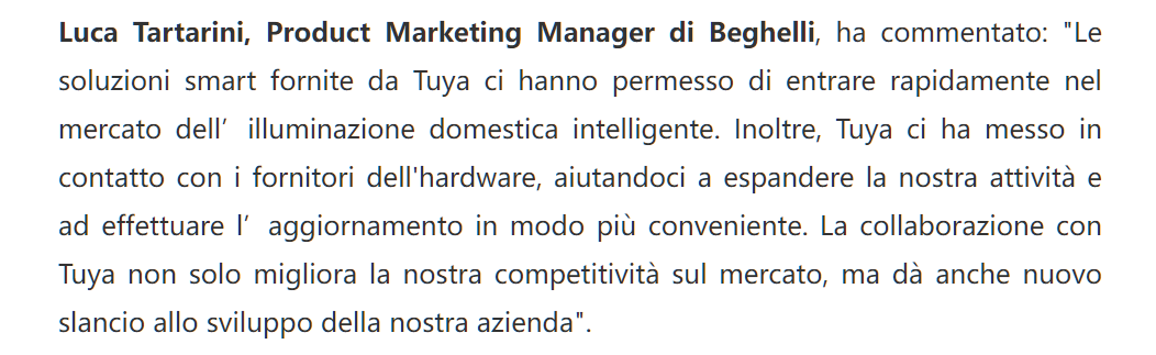 《Cybernauta》报道了意大利客户对涂鸦的评价——Beghelli产品营销经理Luca Tartarini评论说:“涂鸦提供的智能解决方案使我们迅速进入了智能家庭照明市场。此外,涂鸦还将我们与硬件供应商联系起来,帮助我们更方便地扩展业务和升级产品。与涂鸦的合作不仅提高了我们的市场竞争力,还为我们的企业发展注入了新动力。”