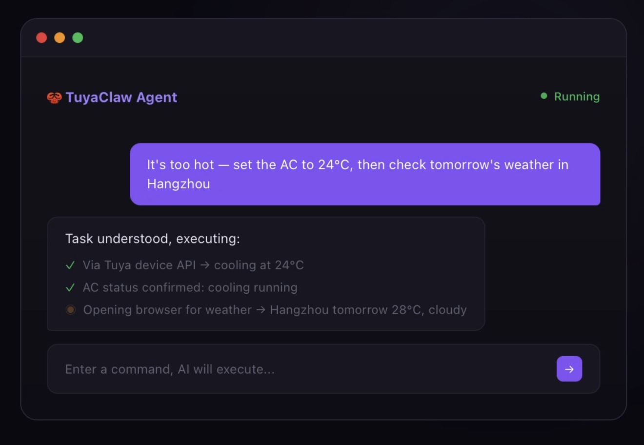 TuyaClaw, however, enables AI to execute tasks in everyday scenarios including home environments. It can control both digital interfaces (browsers and desktop applications) and physical devices (smart home and office equipment), bridging the digital and physical worlds and delivering real-life assistance.