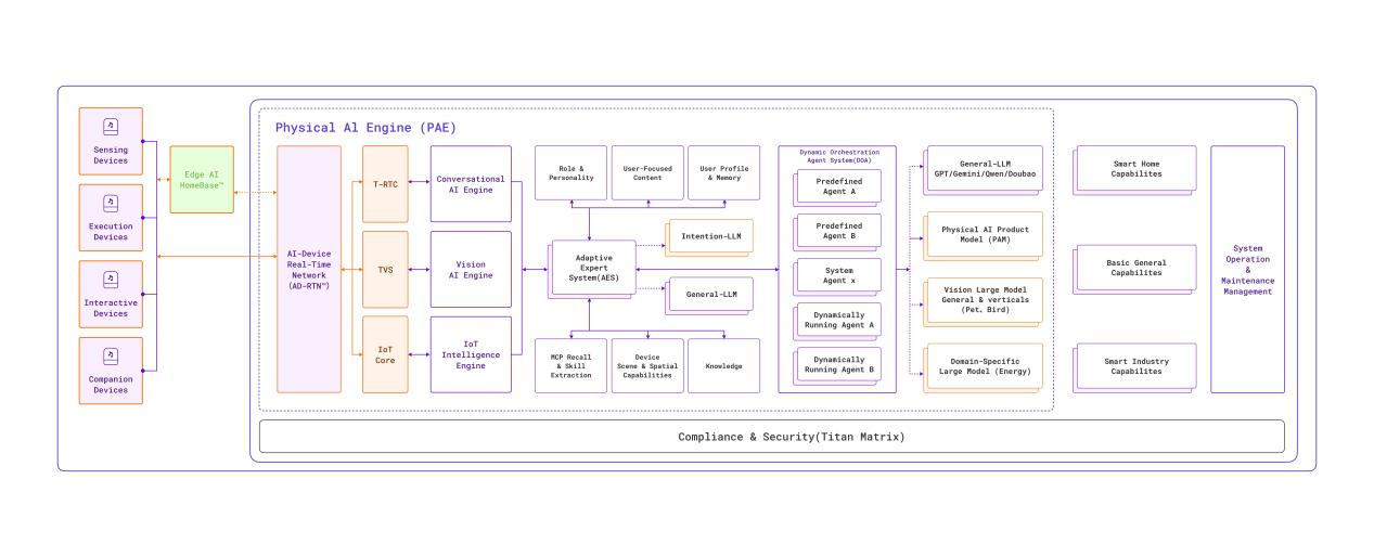 Simultaneously, Tuya unveiled its self-developed Physical AI Engine (PAE) system architecture. As the foundational engine powering Hey Tuya, PAE delivers a stable, secure, and evolvable system framework and directly addresses the complex challenges AI hardware faces when deployed in physical environments. Through a comprehensive architectural redesign, PAE enhances real-world user experience while significantly strengthening data security, privacy protection, and compliance capabilities.